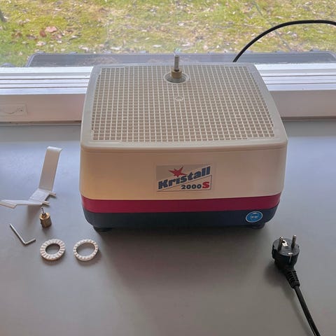 Kristall 2000 lasihiomakone tasomallisella hiomapöydällä. Soveltuu lasin hiontaan ja muotoiluun esimerkiksi lasitöissä ja tiffany-tekniikassa. Laitteessa on muovinen runko, yläosassa valkoinen ritiläpinta ja virtajohto. Päällä liitäntä hiomapään ja mahdollisen vesijärjestelmän kiinnitykselle. Sähkökäyttöinen pöytämallinen hiomakone pienten ja keskikokoisten lasikappaleiden työstämiseen.