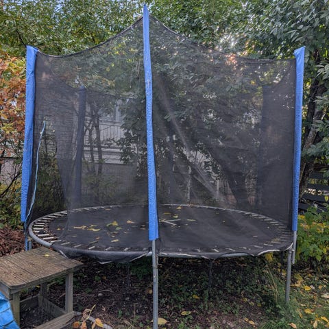 Lapset ei enää hypi ja trampoliini oottanu kuningasideaa jatkojalostukseen, mut taas kesä tulee ja on ruohonleikkuun edessä.