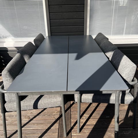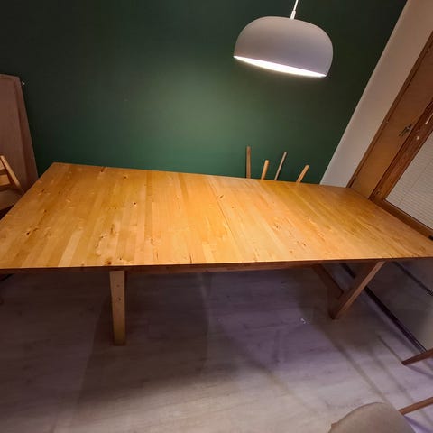 Puinen ruokapöytä + 6 tuolia. Sijaitsee kerrostalossa, omat kantajat mukaan.