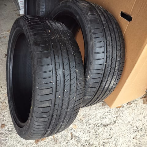 Vredestein kesärenkaat joissa pintaa n. 5mm ja tasaisesti kuluneet. Paistovuosi 23. Yhdessä renkaassa vannesuojan kohdalta pieni pala pois (viimeinen kuva), mutta rengasliikkeestä varmistettu, että ei ole vaikutusta renkaan kuntoon.