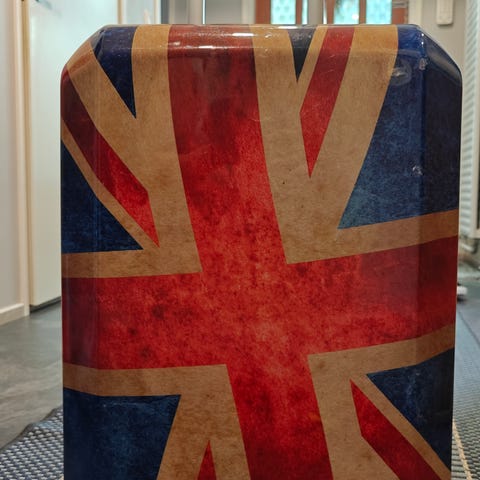 Matkalaukku, kova muovinen kuori jossa monivärinen Coca-Cola-aiheinen kuviointi. Neljä pyörää helpottavat liikuttelua ja yläosassa vetokahva. Ollut käytössä yhden laivareissun, joten lähes uudenveroinen(pääliosan suojamuovi alkaa jostain kohtaa irrota).