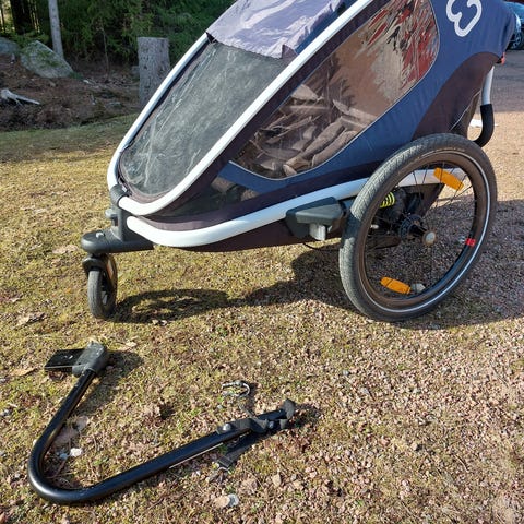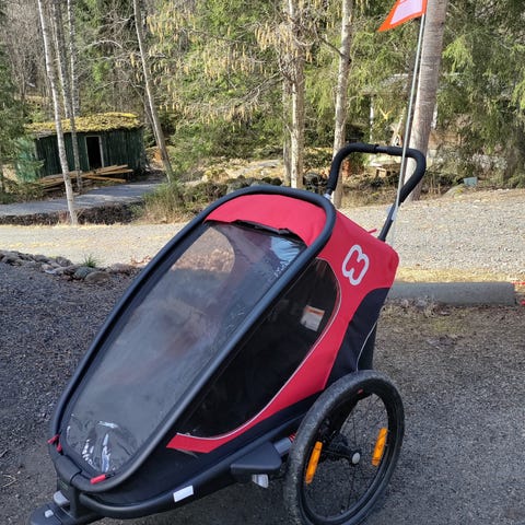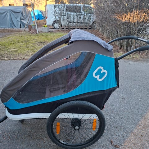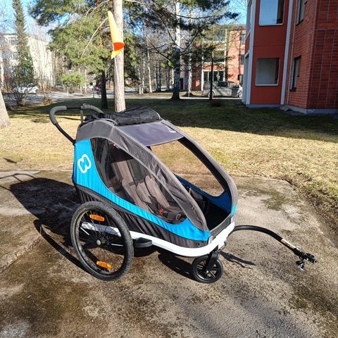 Hamax lasten pyöräkärry. Kahden pyörän peräkärry, joka kiinnitetään polkupyörään vetoaisalla. Väri sininen mustilla ja harmailla yksityiskohdilla. Edessä on läpinäkyvä sadesuoja sekä verkkokangas, jotka suojaavat lasta säältä ja hyönteisiltä. Sopii yhden tai kahden lapsen kuljettamiseen polkupyörän perässä. Kärryssä on heijastimet pyörissä näkyvyyden parantamiseksi. Soveltuu arki- ja vapaa-ajan pyöräilyyn lasten kuljetukseen.