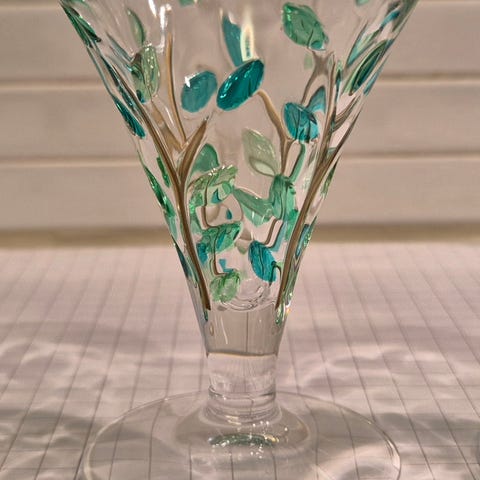 Muranon tarra vielä paikalla. Valitettavasti tekijästä ei tietoa. Samantyylistä aromilasia tehty aikanaan myös Tšekkoslovakiassa tosin pienin eroavaisuuksin.