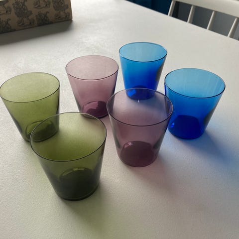 Kaj Franckin Iittalalle suunnittelemat eri väriset juomalasit 1950-luvulta. 7 kpl.
