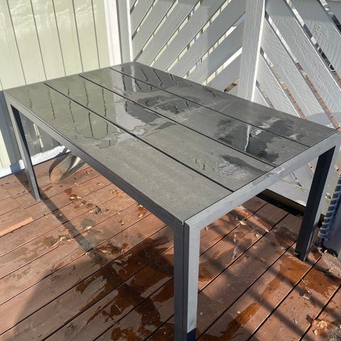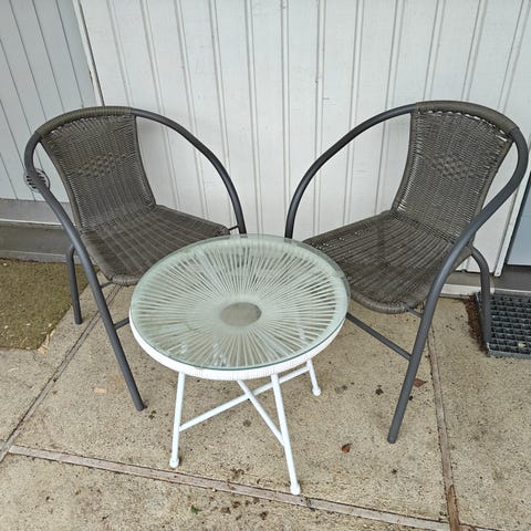 Metallista ja lasista valmistettu puutarhapöytä.