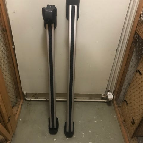Volkswagen kattotelineet henkilöautoon. Väriltään hopea alumiiniprofiili mustilla muoviosilla. Telineissä merkinnät ja ohjekuva kiinnitystä varten. Soveltuu auton katolle esimerkiksi kuljetustarvikkeiden, kuten suksiboksin tai taakkatelineiden, kiinnittämiseen.