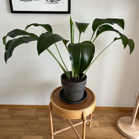 Suuressa 21cm ruukussa, useampi kasvi nipussa, paljon kukkavarsia. Oli pienessä ruukussa hieman liian pitkään mistä johtuu lehtien kärkien pieni ruskettuminen. Hyvävointinen mutta kaipaa valoisaan paikkaan. Näyttävä kasvi esim suurempaan tilaan tai vaikka terassille kesäksi.