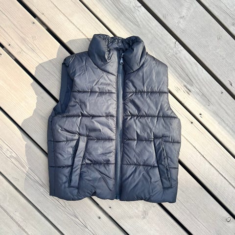 lasten liivi, koko 98. Sininen polyesteristä valmistettu unisex-liivi, jossa eläinkuosi. Edessä vetoketju ja kevyt toppaus. Sopii käytettäväksi esimerkiksi pitkähihaisen paidan tai hupparin päällä lisälämmikkeenä arjessa ja ulkoillessa.