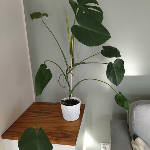 Peikonlehti viherkasvi läpinäkyvässä muoviruukussa, jossa alla reijät. Kasvilla on useita vihreitä, suuria lehtiä. Kasvi voidaan tukea kepeillä kasvun ohjaamiseksi. Korkeus 80 cm.