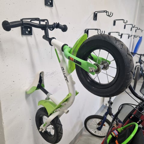 Parhaat päivänsä nähnyt potkupyörä. Käsitappien vaihto freesaa pyörän. Maalia lähtenyt alarungosta
