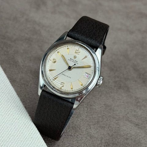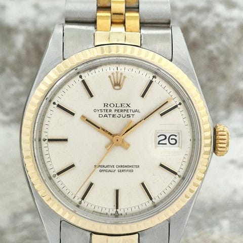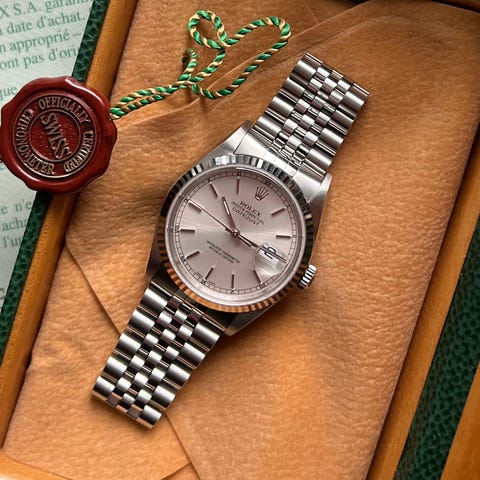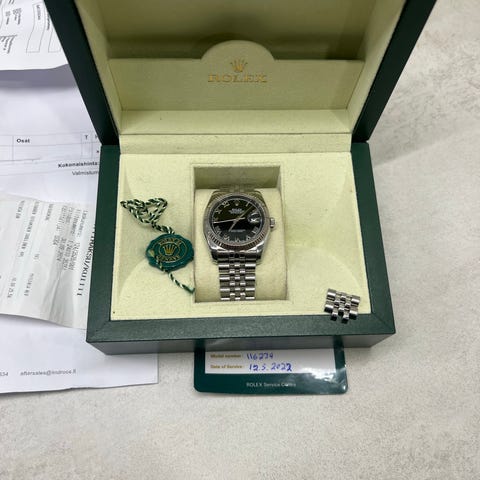 Olemme eurooppalainen myyjä, joten ei 21%:n tuontiveroa, jos olet eurooppalainen ostaja ja täydellisen setin kanssa, mukaan lukien Rolexin takuukortti:Hieno 18k-keltakullan ja teräksen Rolex-naisten kello, automaattisella vedolla ja päivämäärällä sekä alkuperäisellä tehtaalta asetetulla timanttinäytöllä, malli Oyster Perpetual Datejust, ref. 69173G.Tarjolla alkuperäisessä täydellisessä setissä:- Rolexin numeroidut kaksikkopakkaukset,- Kopio täydellisen huoltopalvelun laskusta, päivämäärällä 11-2-2026. (Kellosepän nimi on poistettu yksityisyyden vuoksi).- Numeroitu ja päivämääräinen vihreä Rolex-takuuasiakirja (lokakuu 1994)- Rolexin esitteet "your Rolex Oyster" ja "Rolex Datejust" (1994)- Rolexin kronometriteemalio, - Rolexin numeroitu tunniste, joka vastaa takuudokumenttia.- 2 x varaa linkkiä.Kello on numeroitu lugien välissä lukujen "69173" ja "S607711" välillä, joten tämä Rolex on valmistettu vuonna 1994.Se ostettiin ensimmäiseltä omistajalta 21. lokakuuta 1994 Rolexin "Geneva Watch Company" -liikkeestä Kowloonissa, Hongkongissa, ja on nyt jälleen myynnissä.Kello toimii erinomaisesti. Katso liikettä kuvaamassa suorituskykyä.Rolexin allekirjoittama ja numeroitu 18k-keltakullan ja teräksen rengasranneke.Soveltuu ranteisiin jopa 16 cm ja 17 cm kun käytetään kahta lisälinkkiä.Yksi kuva näyttää Rolexin 17 cm:n ranteella.Nykyinen samanlaisen Rolexin 26 mm malli maksaa yli 17 000 €. Ei juurikaan poikkea 1990-luvun malleista, ja se menettää perinnön, eleganssin ja ainutlaatuisen Rolex-historian arvon. (Katso kuva esimerkkinä).Teräksinen kotelo 18k-keltakullan uritetulla kehällä on 26 mm, pois lukien allekirjoitettu 18k-kulta Rolexin kruunu ruuvikiinnityksellä.Allekirjoitettu champagne-kellotaulu, jossa on 10 alkuperäistä Rolexin tehtaalta asetettua timantia. Päivä nopealla asetuksella. Kulttiviivoihin sopivat osoittimet.Kotelon tuotantotunniste lugien välissä vastaa takuudokumenttia. (Katso yksityiskohtakuva).18k-keltakullan ja teräksen ranneke, jonka sivulla olevat ruuviliittimet ovat helposti poistettavissa tai lisättävissä. Suosittelemme teettämään tämän laadukkaalla korualan ammattilaisella. (Katso yksityiskohtakuva)Rolexin merkkaama automaattikoneisto CAL 2135. Katso kuva.Rolex pakataan huolellisesti ja toimitetaan vakuutettuna seurattavalla toimituksella DHL Expressillä, joten se on luonasi 2–3 päivän kuluttua siitä, kun olet maksanut Catawikiin.HUOM: Ei tuontiveroja EU:n asukkaille, mutta EU:n ulkopuolella asuvat maksavat tullimaksut.OLE hyvä ja jätä positiivinen palaute kun olet täysin tyytyväinen ostokseesi ja palveluumme.Jos johonkin syystä et ole tyytyväinen ostokseesi, pyydämme ystävällisesti ettet jätä negatiivista palautetta, vaan otat yhteyttä meihin Catawiki-viestijärjestelmän kautta, jotta voimme auttaa sinua.