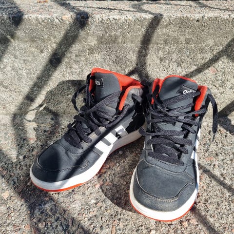 Adidas lasten tennarit, koko 35, unisex-malli. Väriltään mustat valkoisilla raidoilla ja valkoisella pohjalla. Päällinen yhdistää verkkokangasta ja synteettistä materiaalia. Kiinnitys tarranauhalla ja joustonauhoilla, mikä helpottaa pukemista. Pohjat kumia. Soveltuvat arki- ja koulukäyttöön sekä tytöille että pojille.
