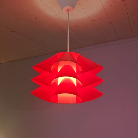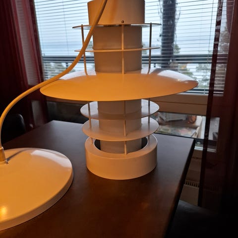Hyväkuntoinen retro valaisin. Ulkoa hopea/musta. Sisäpuolelta valkoinen/oranssi. Polttimon kanta ei ole alkuperäinen. Ei kattokuppia/pistoketta. Alumiiniä. Halkaisija 30cm.