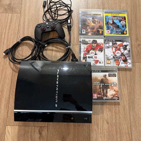 Sony Playstation sekä ohjain ja tarvittavia johtoja.