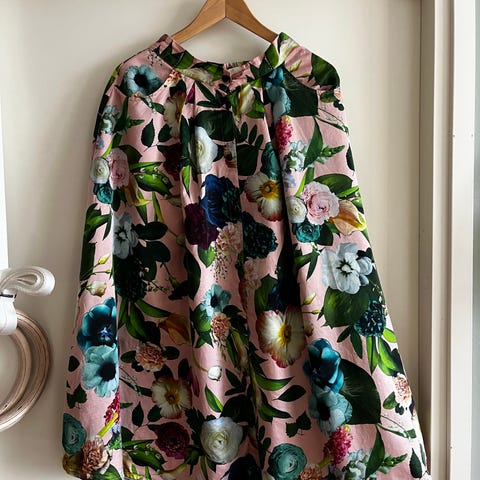Helmassa lähellä sivusaumaa pienen pieni jälki, joka ei lähtenyt normaalissa pesussa. Hukkuu kuitenkin onneksi hyvin tuohon kuosiin (ks. viimeinen kuva). Muutoin hame siistissä ja hyvässä kunnossa.