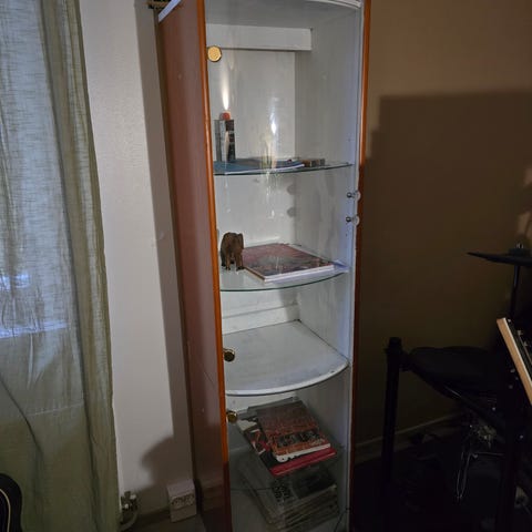 Retro lasikaappi. Edestä ja päältä siisti, sivuissa ja sisäpinnassa kulumaa, kaikki näkyy kuvista.