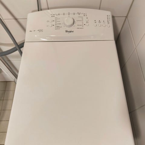 Whirlpool päältä täytettävä pesukone. Väri valkoinen. Ohjauspaneelissa valintanuppi ja digitaalinen näyttö eri pesuohjelmia ja asetuksia varten. Kone soveltuu pyykin pesuun kotitalouskäytössä. Mukana tulevat vesiletku ja poistoletku kuvien mukaisesti. Tarkemmat tekniset tiedot, kuten kapasiteetti ja mitat, eivät käy ilmi ja ne voi tarvittaessa tarkistaa mallimerkinnästä koneen takaa tai sivusta.
