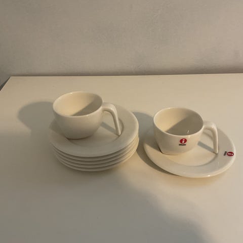 Iittala ego -sarjan espressokupit ja aluslautaset. Astiat uudenveroisia. upin korkeus n. 4,5 cm, halkaisija n. 6 cm. Aluslautanen n. 12 cm.