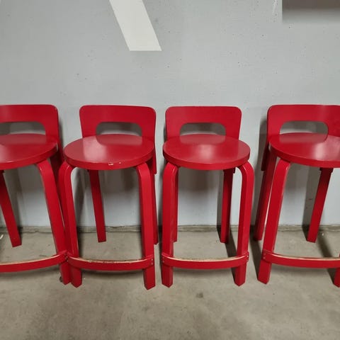 Artekin tuoli punainen istuinosa. Hinta on kappale hinta. Tuoleissa on jonkinverran käytönjälkiä. Tuolit ovat tukevia.