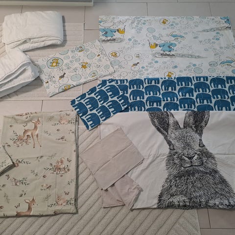 Lasten pussilakana+tyynyliinasetit, joista 1 Pentikin metsäneläimet ja 2 Veken kalusteen settejä (vaaleanvihreä ja beige ruudullinen). Olleet yhdellä lapsella käytössä ja ostettu uusina joskus 2021-22. Siisti kunto ja ehjät. Pesty vain hajusteettomilla pesuaineilla ja säilytetty lämpimissä sisätiloissa. Huom. Lasten lakana/peittokoko pussilakanassa ja tyynyliinassa eli sopivat parhaiten 1,5 - 4 -vuotiaille. Myynnissä myös näihin sopiva Familonin ensityyny.