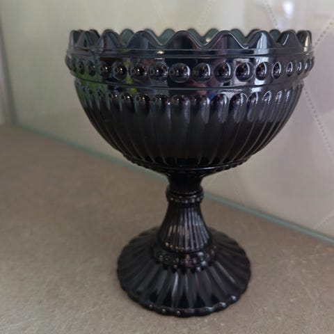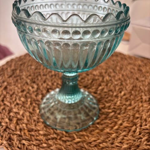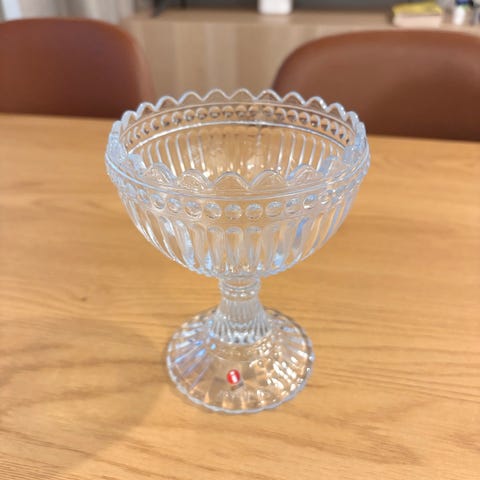 Iittala Mariskooli. Kirkasta lasia, koristeellinen kuviointi sekä kulhon reunassa että jalassa. Sopii esimerkiksi jälkiruokien, hedelmien tai makeisten tarjoiluun sekä kattauksen osaksi.
