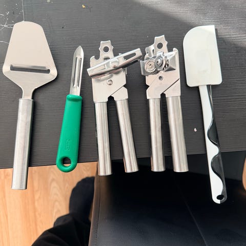 Paistokasari kannella, grillipannu, kauha ja kaksi lastaa.