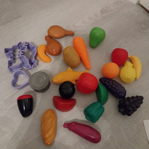 Kaksi settiä sekalaisia leikkiruokia hedelmistä ja vihanneksista kaloihin, lihoihin, hamppareihin ja jätskeihin.