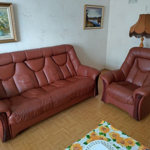 Sohva on hyväkuntoinen. Se sopii mainiosti isommalle perheelle olohuoneeseen.