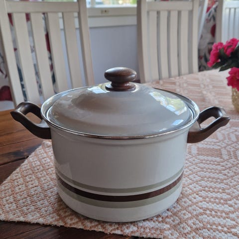 Arabia Wärtsilä Wihtori emaloitu kattilasetti, jossa kaksi erikokoista kattilaa. Pienempi kattila on sisäpinnoiltaan tummunut ja siitä puuttuu kansi joten sen saa tässä kaupan päälle. Upea setti näytille tai arkikäyttöön