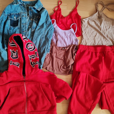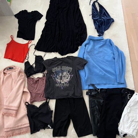 Vaatteet ehjiä, rypyssä säilytyksen takia. Vaateet kokoa s-m, vaikka lapussa lukisi toisin.
