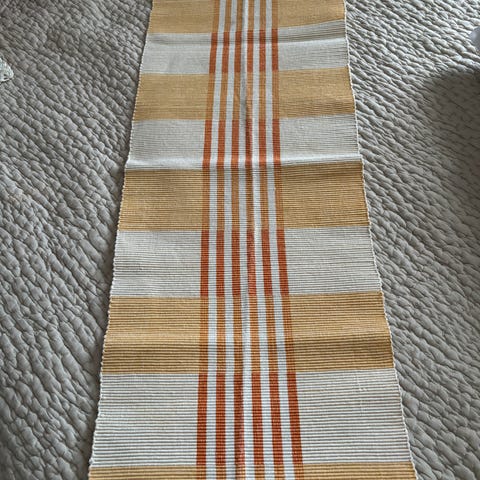 Siisti mustavalkea liina. Koko 33x108. Hinta 7 euroa.
