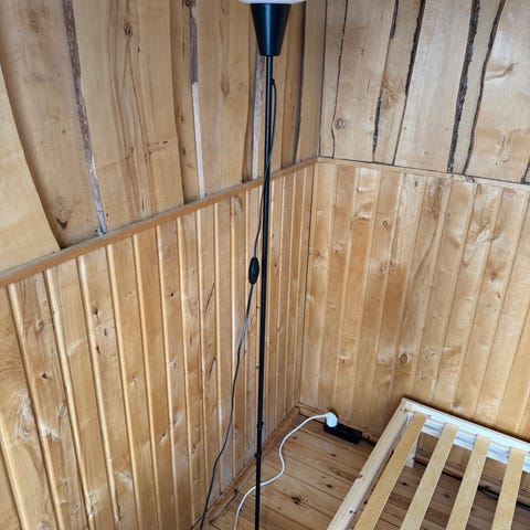 Lattiavalaisin kolmijalka, korkeus 65cm, en muista mistä ostettu, mutta käyttämätön, nyt kokeilin että toimii