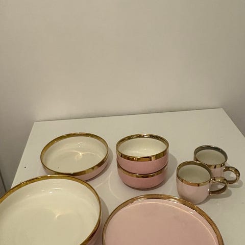 Neljä pientä vaaleanpunainen/valkoinen kulhoa. Sopii tarjoiluun tai myöskin lastenleikkiastiastoksi kokonsa puolesta.