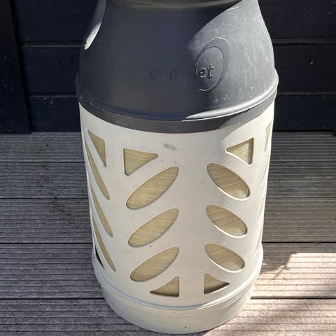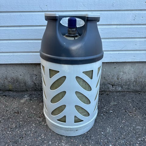 Composite kaasupullo ulkokäyttöön, harmaa-valkoinen runko. Pullo on komposiittimateriaalia, jossa on kantokahvat yläosassa helpottamaan siirtelyä. Soveltuu esimerkiksi grillaukseen, retkeilyyn tai muuhun kaasulaitteiden käyttöön. Tarkka tilavuus ja kaasun määrä eivät käy ilmi kuvista ja on hyvä varmistaa erikseen.10kg