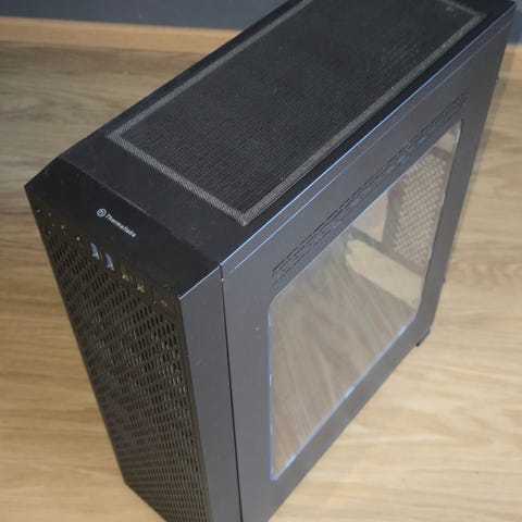 Cooler Master lasikylkinen atx-kotelo, jossa on asennettuna 4kpl led-puhaltimia. Kotelosta puuttuu 3.5” levyjen kiinnitykseen tarvittavat sivutuet.