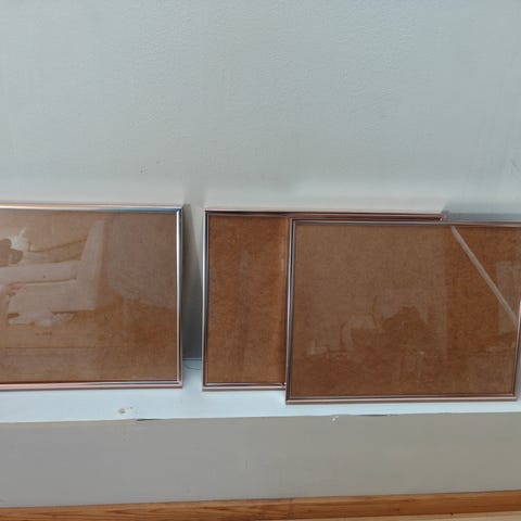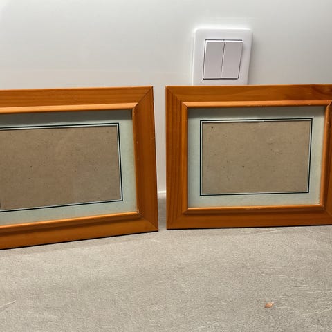 Valokuvakehyksiä 2kpl. Kuvan koko 13 x 18cm. Koko kehyksen koko leveys 15cm, korkeus 20cm. Kehyksen saa pystyyn pöydälle. Kehyksissä vähän jälkiä. Katso kuva. Tummentumat ensimmäisessä kuvassa tullut varjo kuvatessa.