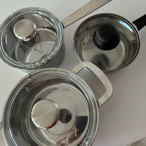 IKEA keittiövälineet ja -astiat setti. Kuvissa näkyy paistinpannu, kattila lasikannella ja metallisella siiviläkannella, pressopannu/kahvipannu, puinen leikkuulauta sekä muovinen lasta ja mittalusikka. Setti soveltuu ruoanlaittoon ja kahvin valmistukseen kotikeittiössä. Materiaalit ovat pääosin metalli, lasi, muovi ja puu.