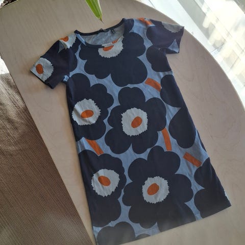 Ihanin marimekon collegesetti. Valitettavasti pohjaväri otti pesussa itseensä ja osaan kukkiin jäi tuollaisia läiskiä sekä pohjaväri tummui. Yleis ilme kuitenkin edelleen siisti. En syynää jokaista kukkaa erikseen, mutta kuvista näkyy mitä seassa saattaa olla. Nämä huomioitu hinnassa