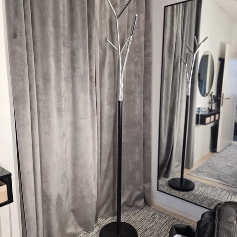 Erittäin tukeva lattianaulakko. Mustaa metallia / tummaa puuta. Koukut molemmin puolin.