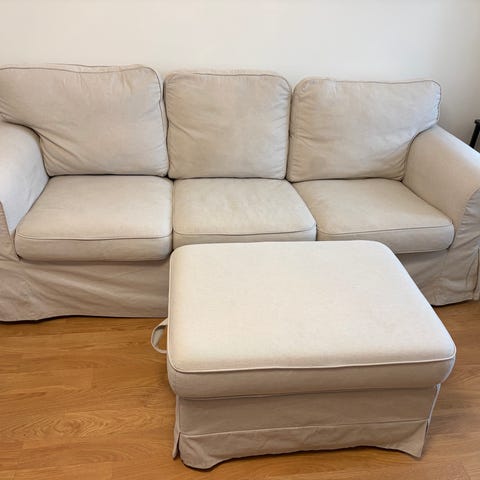 3 istuttava sohva +toiset valkoiset päälliset. Käytetty, siisti ja vielä käyttökelpoinen sohva. Jotakin hyvin haaleaa pientä käytönjälkeä voi löytyä päällisestä.