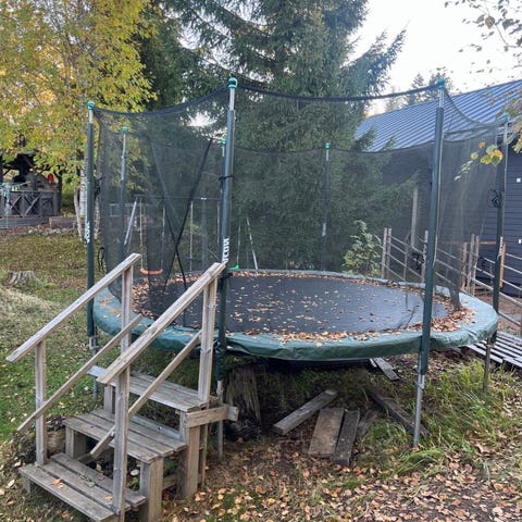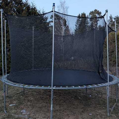Paikoillaan seissyt malli, hiukan pehmeä pomppuosa. Sammalta verkossa ja jne. Pari viime talvea ollut ulkona.