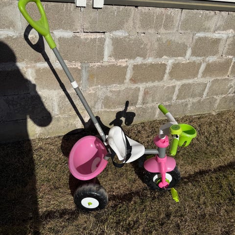 Kolmipyörä irrotettavalla työntöaisalla. Pikkuiselle istuimessa pehmuste, turvavyö ja aurinkolippa. Myös turvakaari istuimen ympärillä. Etupyörän saa lukittua kun aikuinen ohjaa aisasta.