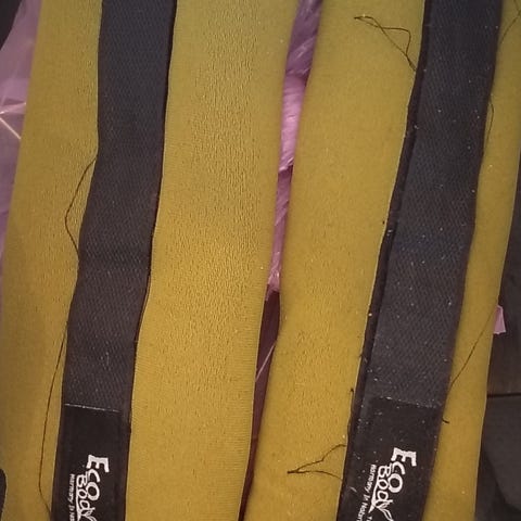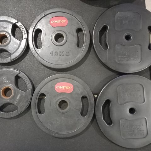 Lukkoja 6, 4 kpl 5 kg ja 4 kpl 2,5 kg ja 6 kpl 1,25 kg. Tanko metallia 5kg ja käsipainojen kahva 1 kg.