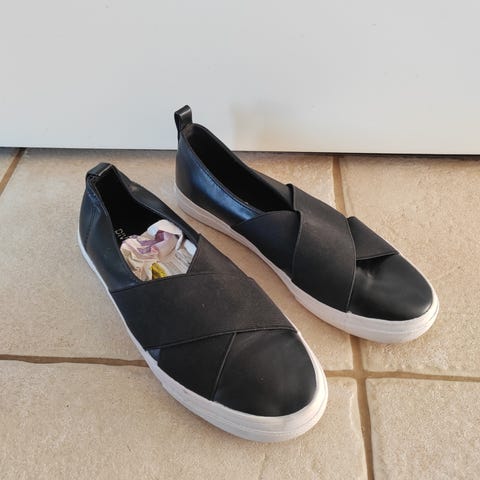 Kengät on tikatut naisten tennarit, joissa on paksu valkoinen pohja & kiiltonahkainen kärki. Kengät on käytetyt mutta hyvässä kunnossa.