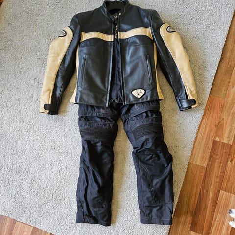 Yhtenä kesänä käytössä ollut takki ja käyttämättömät housut, uudenveroiset. Ostettu n. 188cm/115kg kuskille niin että sopii vielä paksumpaa vaatetta väliin tarvittaessa.
