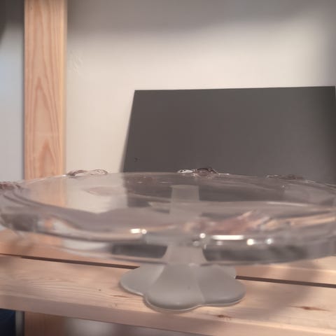Uudenveroinen lasinen jalallinen kakkuvati. Korkeus 11cm, Ø 30cm.