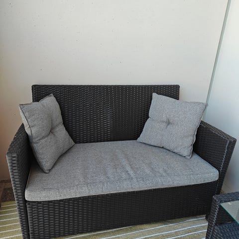 Harmaa polyrottinkinen puutarhasohva (hieman tummempi!) ja lasikantinen pöytä ulkokäyttöön. Sohva kahdelle hengelle. Pöydässä on suorakaiteen muotoinen lasikansi. Materiaali on polyrottinkia, joka soveltuu terassille, parvekkeelle tai puutarhaan. Setti tarjoaa istumapaikan ja pöytätilaa ulkoruokailuun tai oleskeluun. Settejä myynnissä kaksi kappaletta, yhden setin hinta 60e. Nopein saa kaupan päälle pari tuolia (+pari huonokunt.halutessa). Vain nouto!