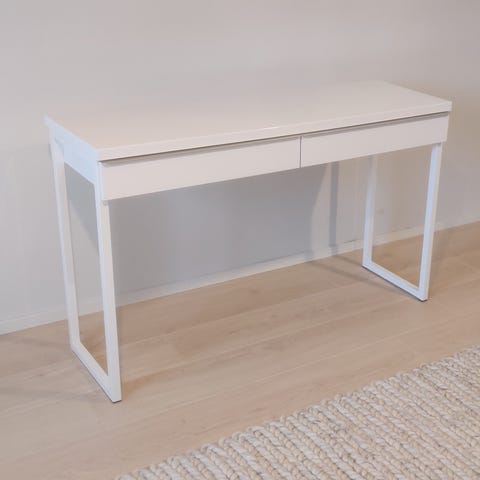 Valkoinen kapea työpöytä, jossa on kaksi pitkää vetolaatikkoa. Pöydässä on suorakulmainen kansi ja metalliset jalat, jotka muodostavat kehysmäisen rakenteen. Sopii esimerkiksi työpöydäksi, konsolipöydäksi tai sivupöydäksi tiloihin, joissa tarvitaan kapea mutta pitkä taso ja säilytystilaa pientarvikkeille.