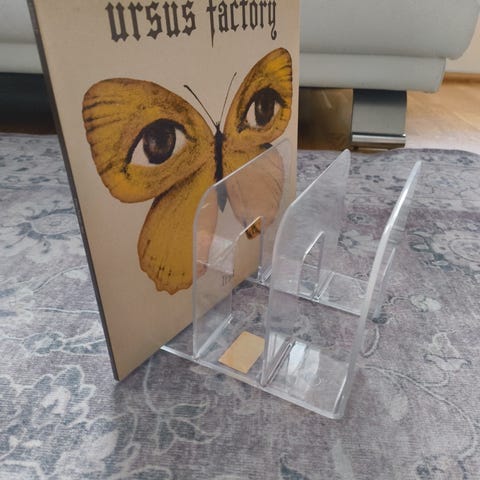 Trendikäs metallinen teline LP-levyille tai lehdille. Pientä käytönjälkeä ja patinaa, mutta oikein käyttökelpoinen ja edustava.