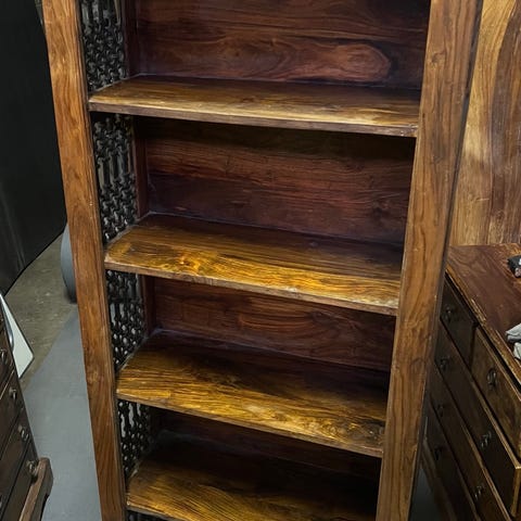 Ruskea hyväkuntoinen hyllykkö, jossa metallikiskoilla kulkevat laatikostot keskellä. Painavuuden ja koon takia nyt purettu osiin ja kuljetettavissa autossa. Helpot kokoamisohjeet mukana.